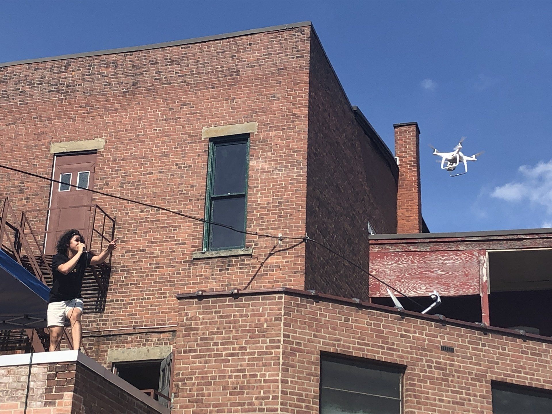 Left and top right: Make Music NWCT t-shirts, drumsticks and harmonicas. Photos by Anya Stephenson, @shotbynya. Bottom: Knowte pointing at the drone camera. Photo by Maddie Stenson.