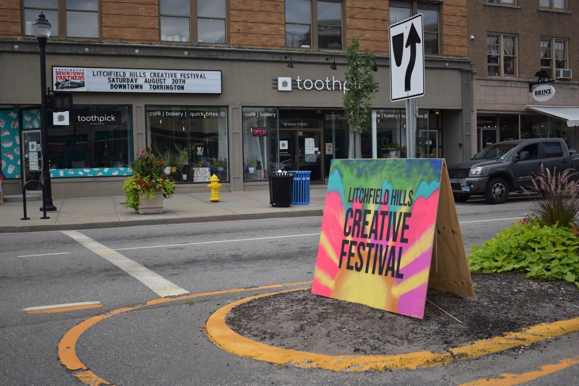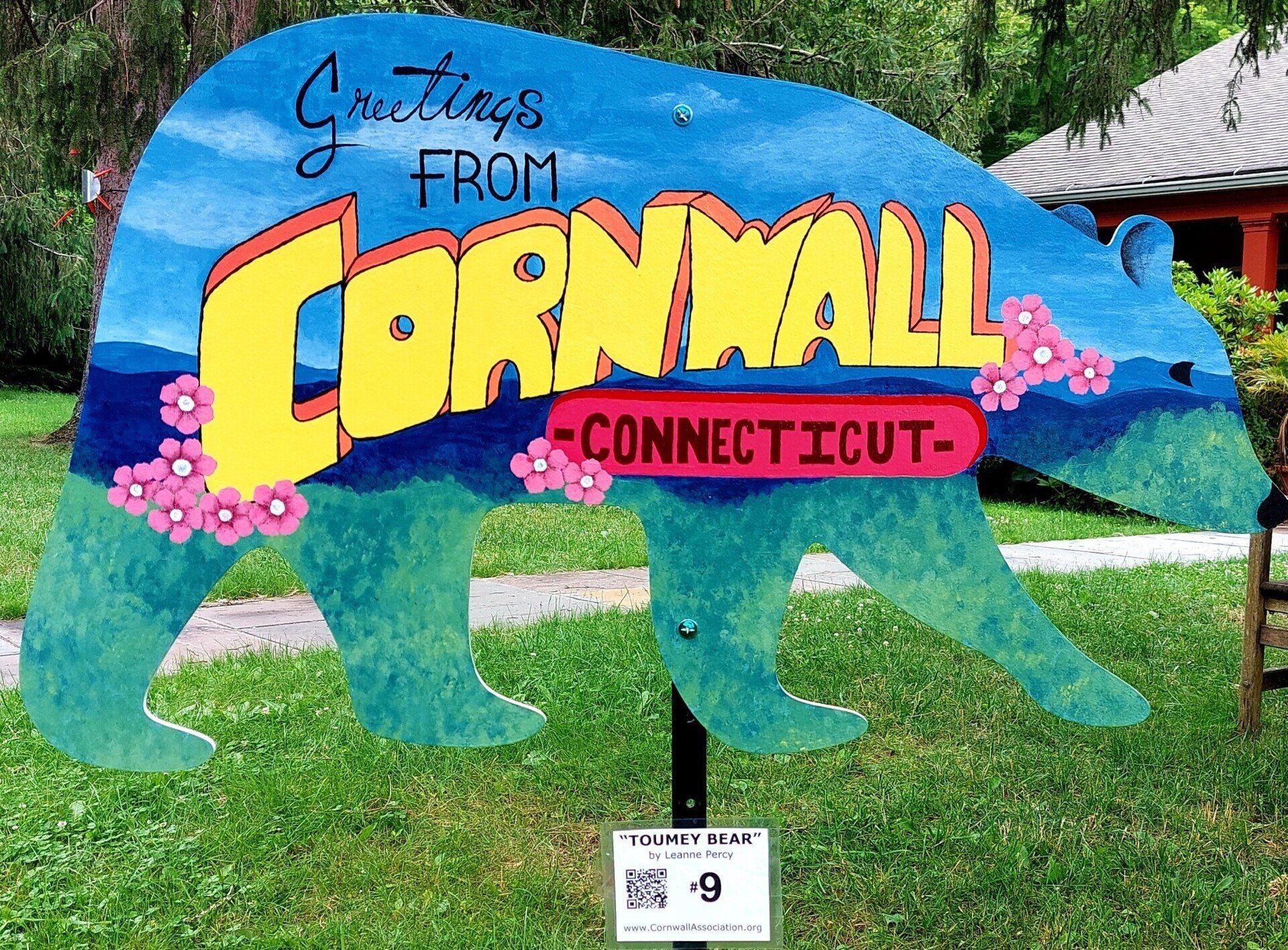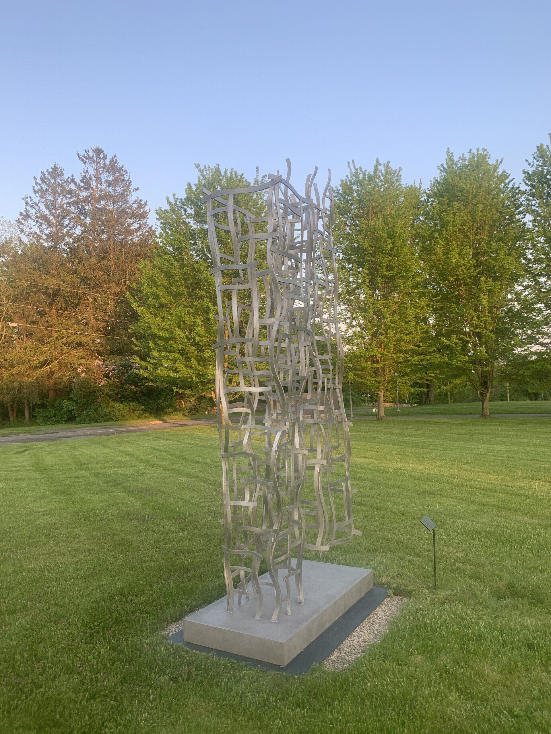 Open House, Don Gummer. Photo by Kathleen Hulser. Sculpture loves the sky, taking cloud, rays, forest and field as volumes to shape. Don Gummer’s sculpture spread around the generous acreage of the Five Points Art Center in Torrington, Connecticut features porous structures that frame and reframe the environment, letting metal members melt into the natural world. These sorts of installations carry much persuasive power, lying just a hop and a skip from the birthplace of John Brown, the abolitionist with ferocious anti-slavery convictions. Those freedom vibes infuse the site to this day. The center has all kinds of art labs: drawing, printmaking, digital, ceramic, photo, painting studios, a children’s space and a handsome auditorium for artists to unleash their free imaginings. At Don Gummer’s opening last week, we approached the piece Open House from the back, and I immediately took it for a variation on tree house. The metal slats and open sides made me think of our childhood motley fabrication of tree houses we built from scavenged lumber. But Gummer’s pieces have both symmetry and undulation to them, executed in metal with burnished edges. The Center’s splendid location atop a rise just slightly lower than nearby Brandy Hill means that every bit of outdoor art has room to breathe amidst inspiring surroundings. For example, Gummer’s work Towers seems to brandish swaying branches to the sky from the side angle, while loosely rising like a skyscraper in the front view. Intriguingly, one tower rests on a slab pedestal, while hangs suspended, a serious co-dependent, wielded to the first on the upper floors. Fittingly, the Gummer sculpture Mondrian greets visitors at the entry, its glass squares in primary colors nodding to the Dutch Piet Mondrian’s geometric preferences and De Stijl roots, bucking conventions and proclaiming modernist freedom. The Five Points Art Center which opened in 2021 has a magnificent 90 acres and plans to feature environmental work and many more displays of outdoor sculpture. There is currently an environmental art work mown in the field near the sculpture park.