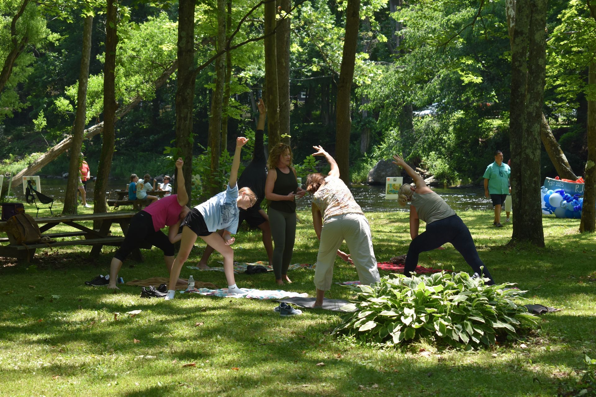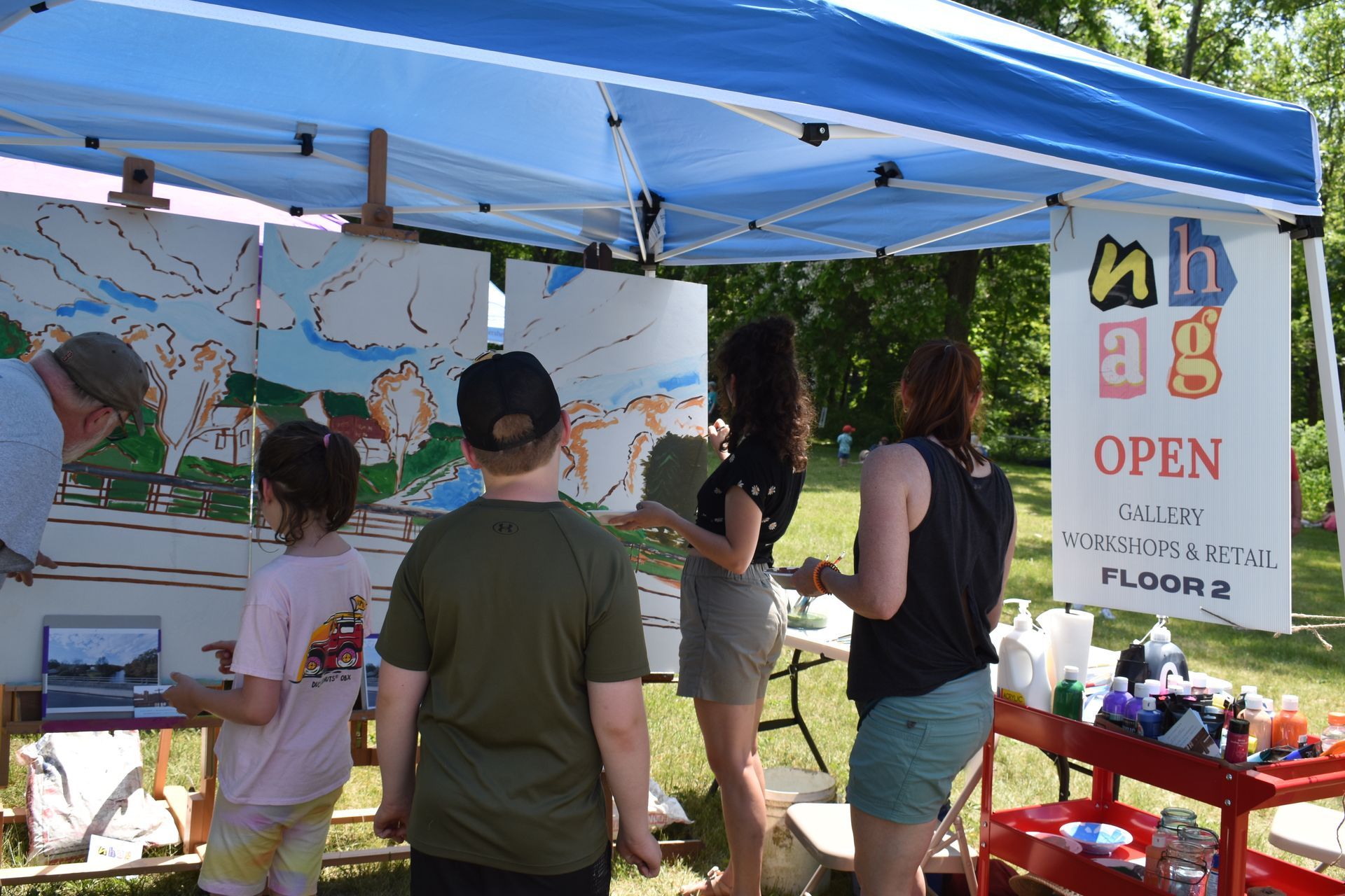 Images: (Right) Vendor Booths, (Middle) New Hartford Artisans Guild Community Painting & Booth, (Left) LAM Yoga Class at the RiverRocks Music Festival
