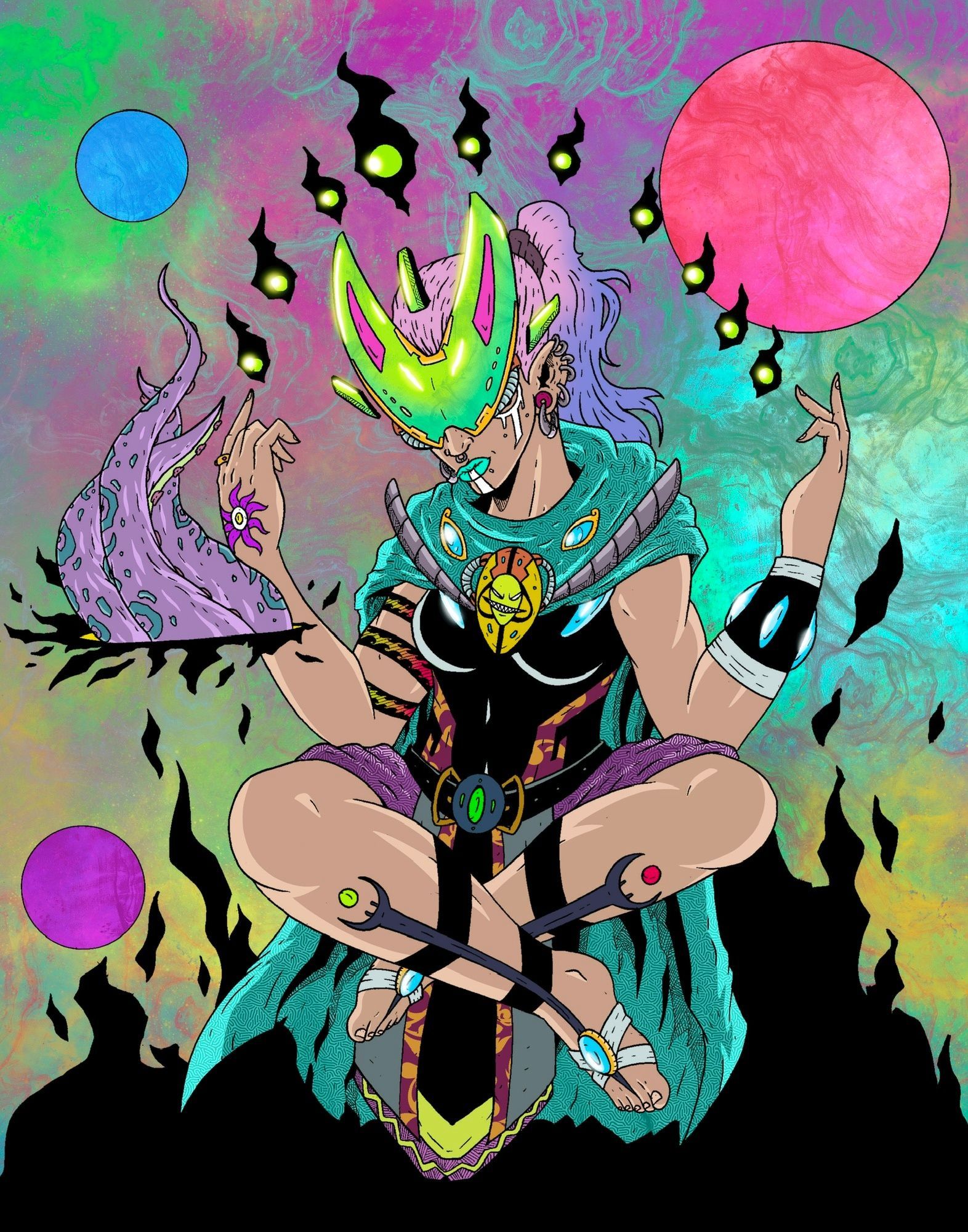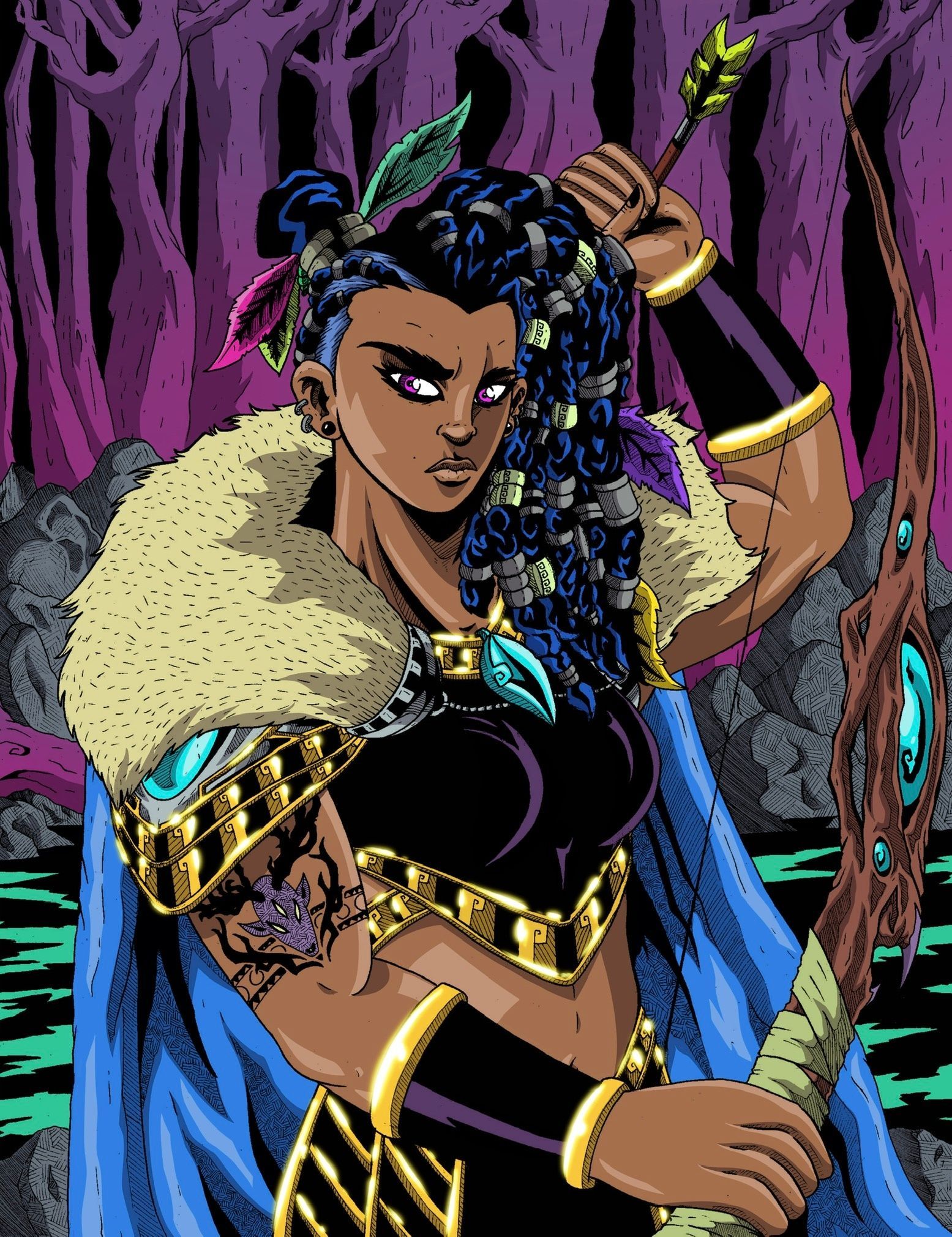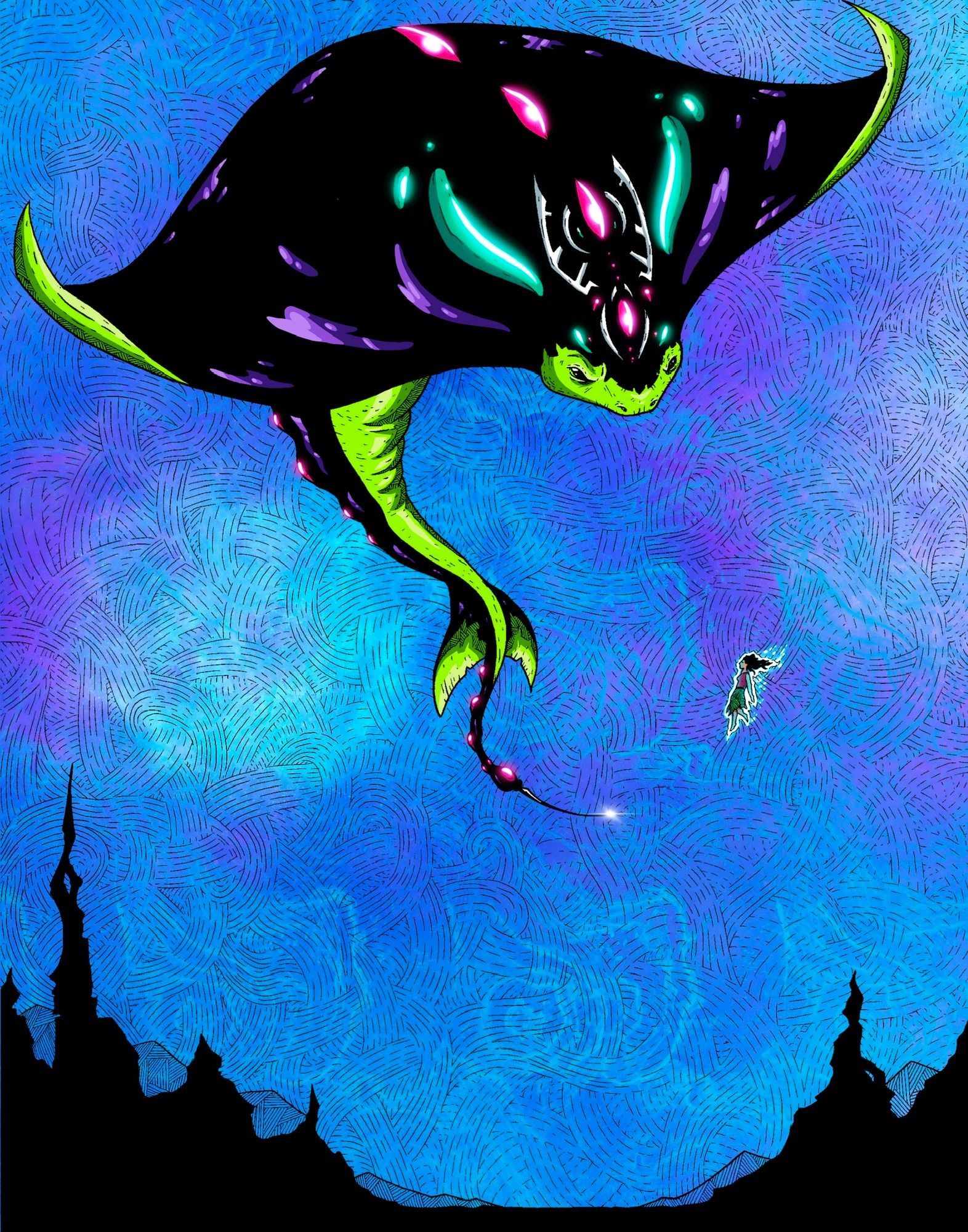 Nick creates imaginative illustrations and paintings bringing mythical creatures and original characters to life. Using neon color and stark contrast, his artwork provides a window into fantastical worlds.